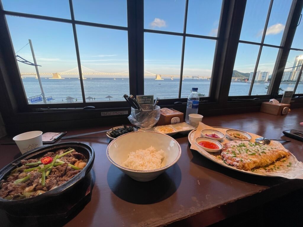 Authentic Korean dishes served at a waterfront restaurant in Busan, South Korea, featuring sweeping views of Gwangan Bridge and the coastline. One of the most scenic dining experiences in Korea.