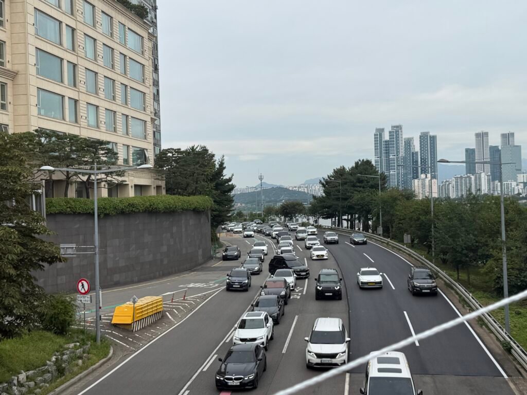 After leaving COEX, we decided to walk north and ended up crossing Cheongdam Bridge, for an unknown reason, looking back.