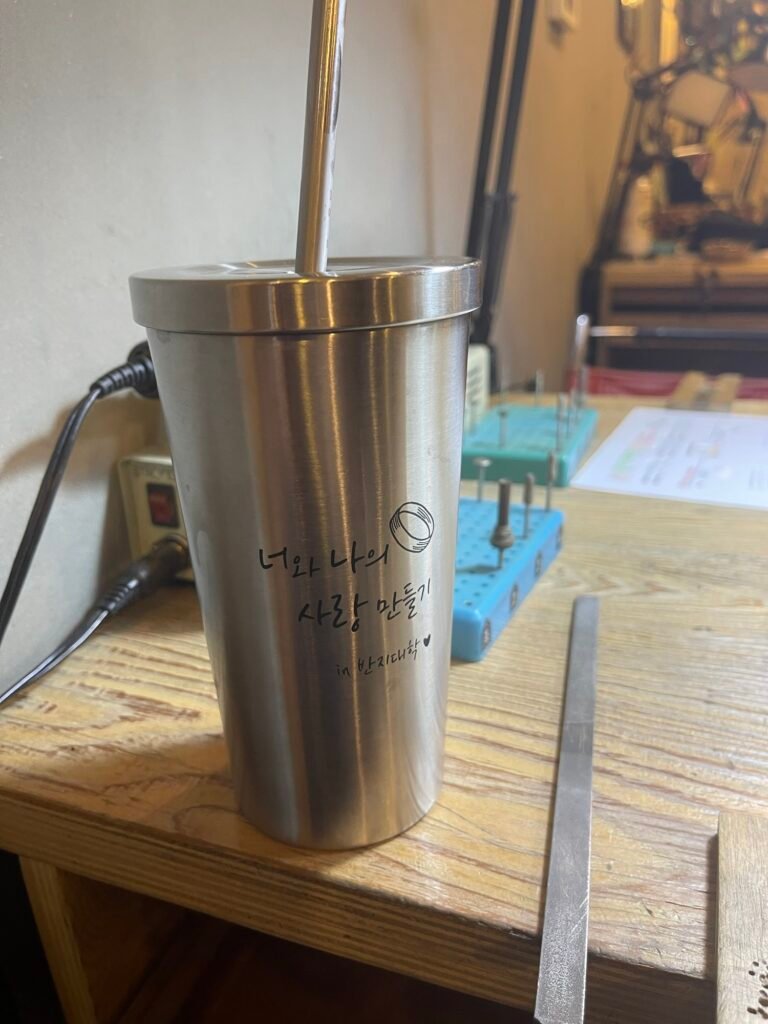 Even if other couples are present, each table has its own instructor, so the experience still feels one-on-one. Soft, relaxing music plays throughout the class, and there’s a small coffee bar behind the register. They even provide tumblers with lids so no metal shavings accidentally end up in your drink, which is such a thoughtful detail.